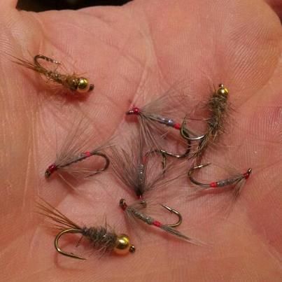 The hares ear goldhead nymph on the point and an iron blue dun on the dropper.