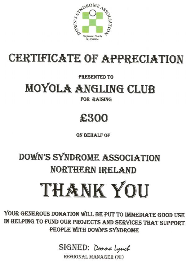 The Club received a certificate recently from the Downs Syndrome Association to say thanks for the £300 donation raised at the annual charity competition in August. A total of £600 was raised and split between the Castledawson Branch of Cancer Research and The Downs Syndrome Association.